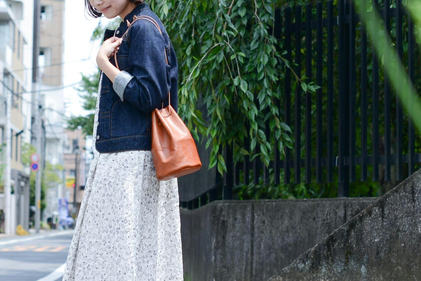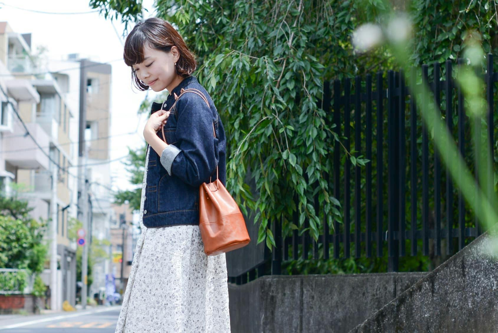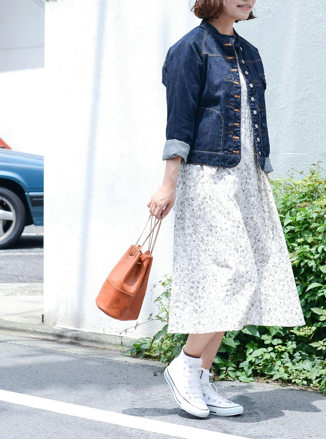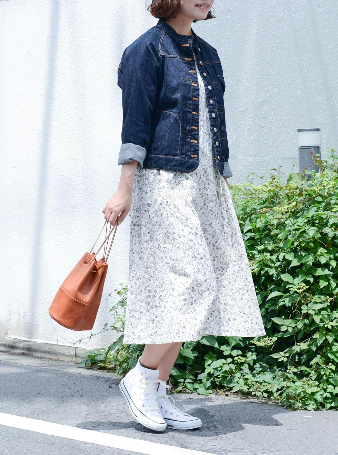 (デニムジャケット:Si-Si-Si、ワンピース:pot-pourri、シューズ:コンバース)