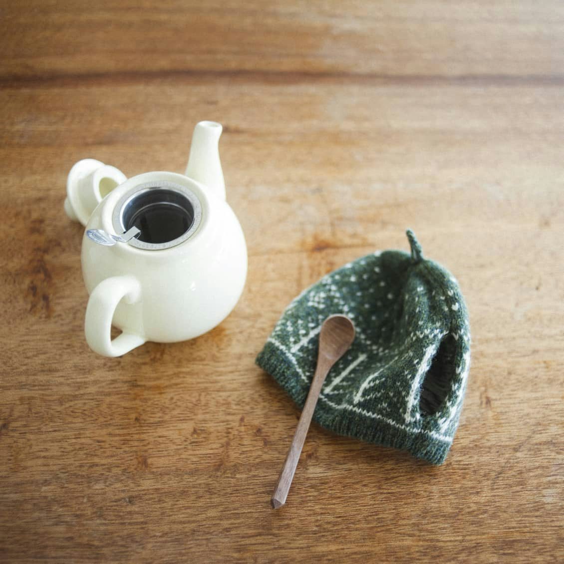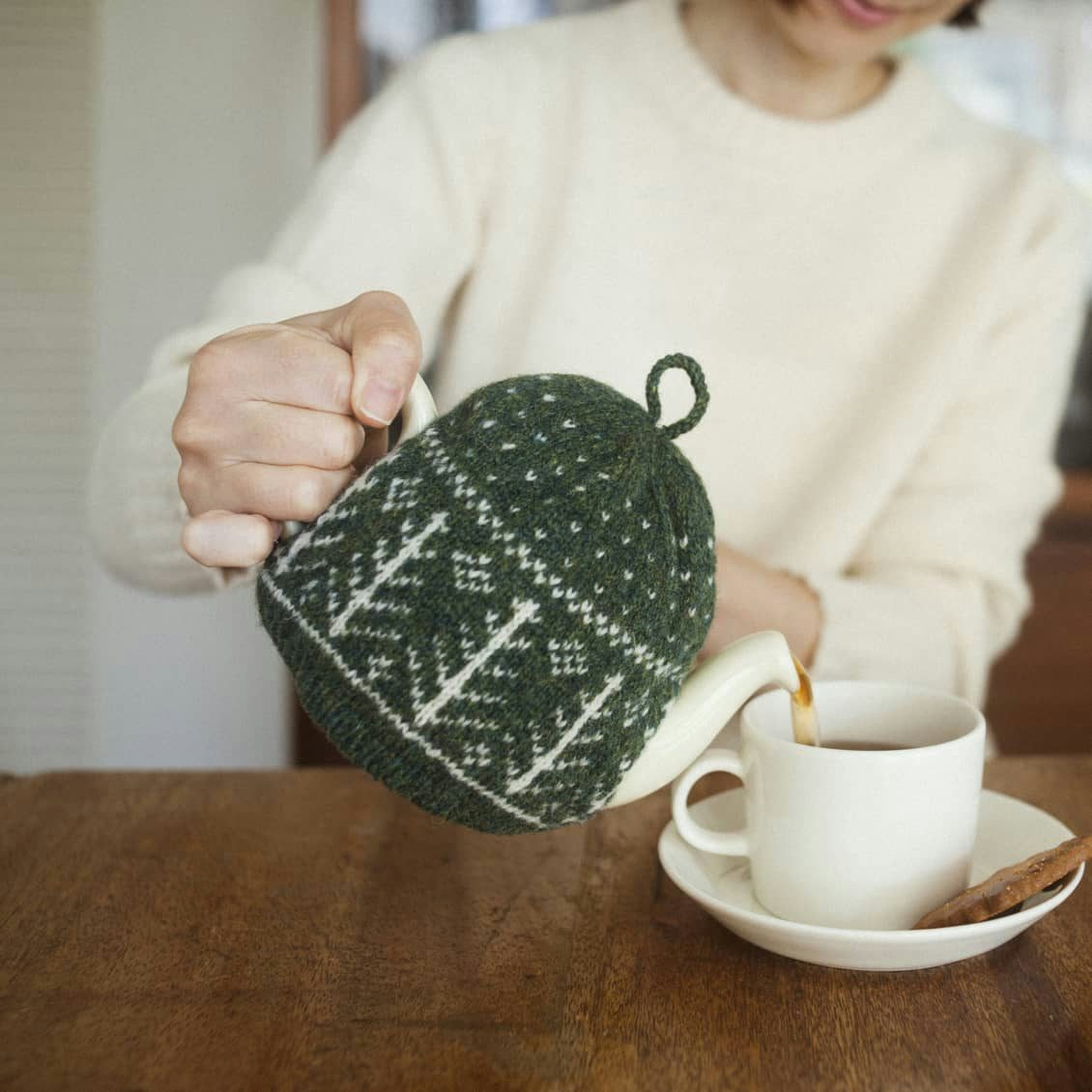 ポットの曲線に柔らかくフィットするニット素材なので、おしゃべりに夢中になっているあいだも、お茶は温かく保たれたまま。