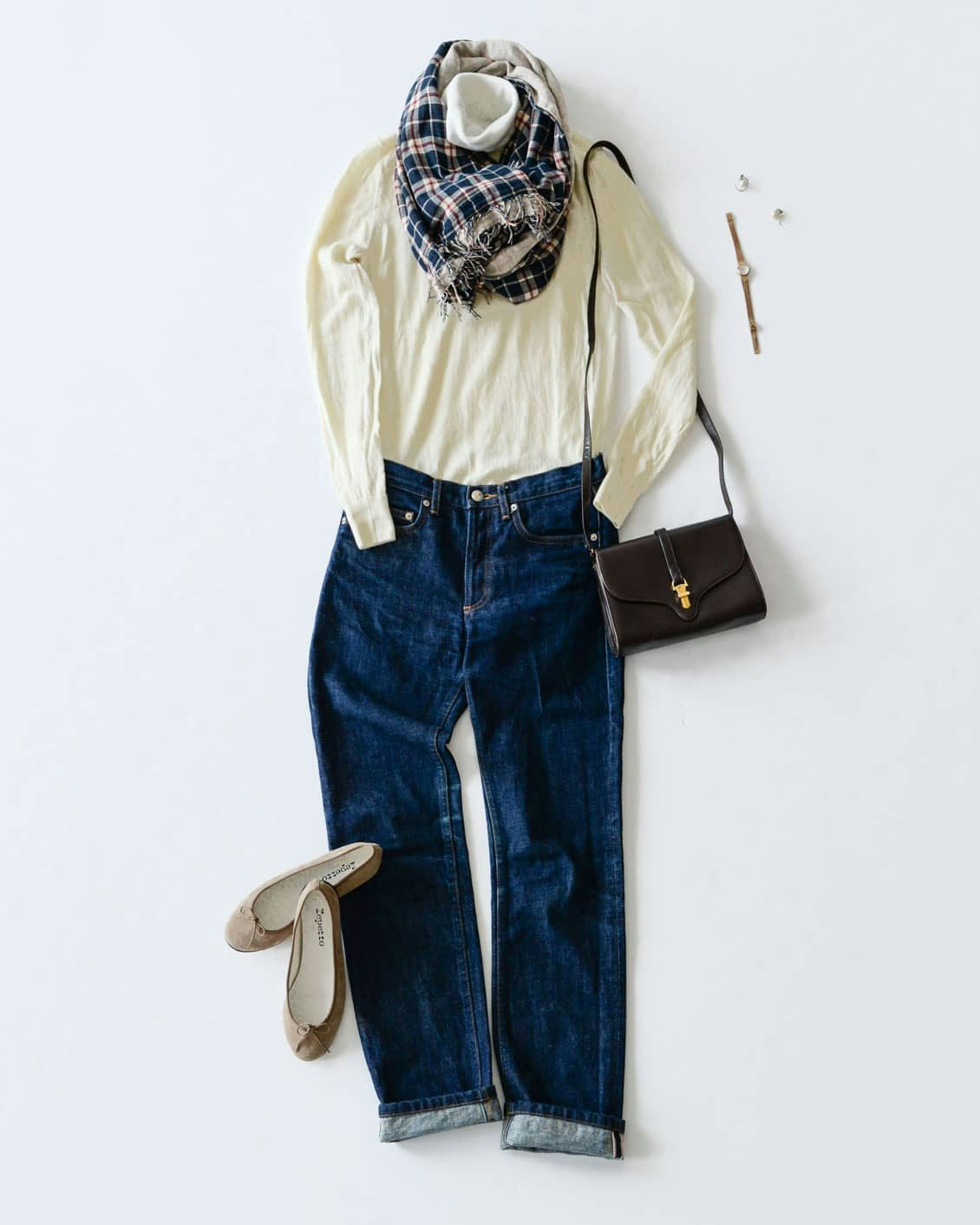 タートルネックやデニムといったベーシックなアイテムも、レペットを合わせることで大人のシンプルコーディネートになります。
