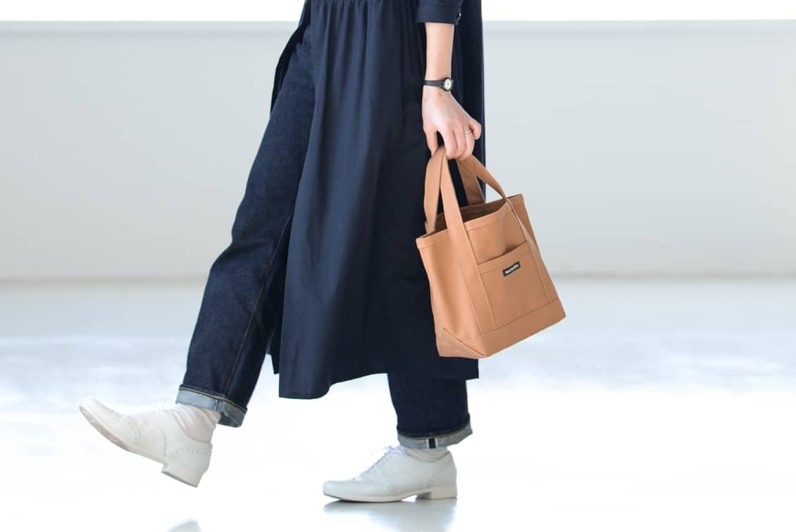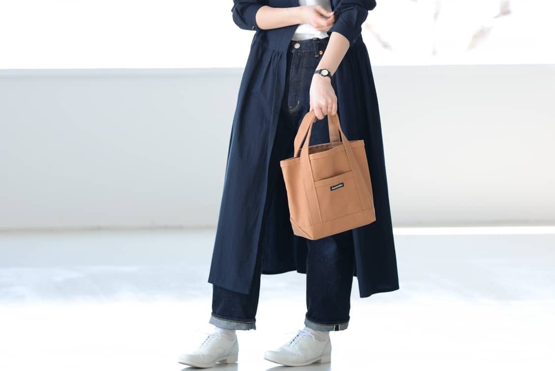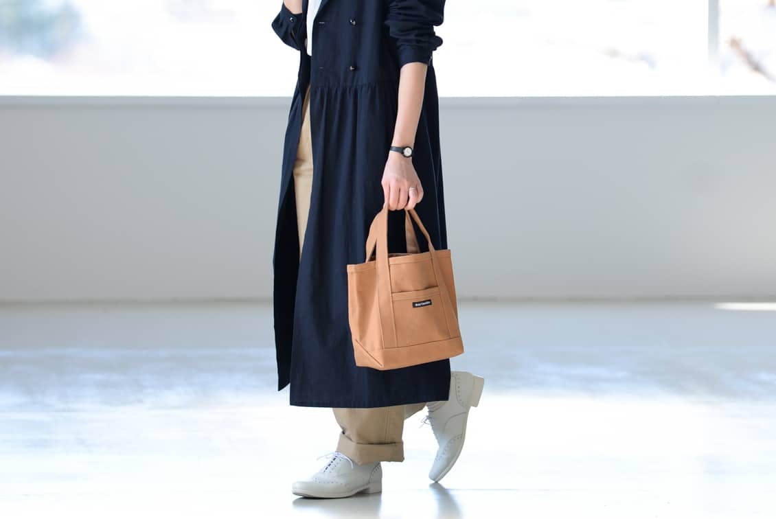 しっかりした厚みのあるキャンバス生地なのに、ラフすぎず、程よくキチンとして見えるから、気取らないふだんの装いにも、少しオシャレして出かけたい時にも馴染みます。
