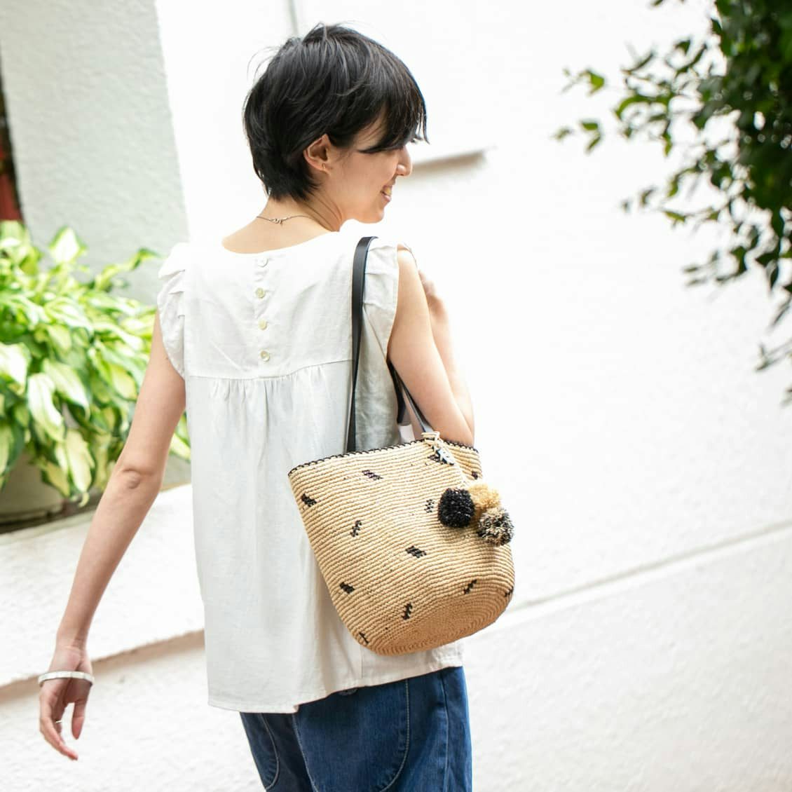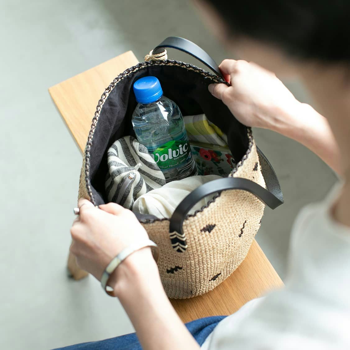 軽くて丈夫なラフィアのバッグは、旅にもおすすめ。