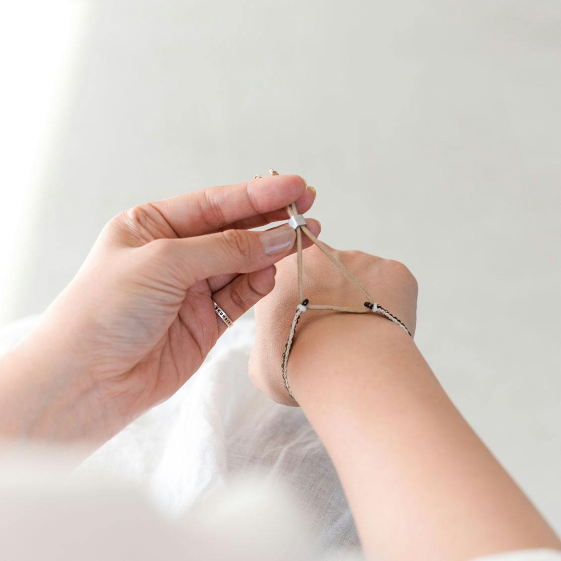 着脱の際は、ブレスレットの先を固定して、メタルビーズのスライダーを手首に合わせてスライドさせます。