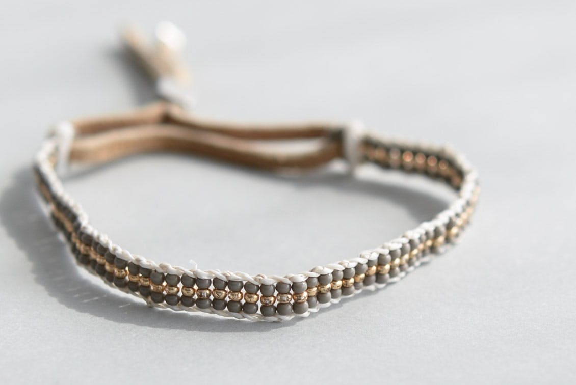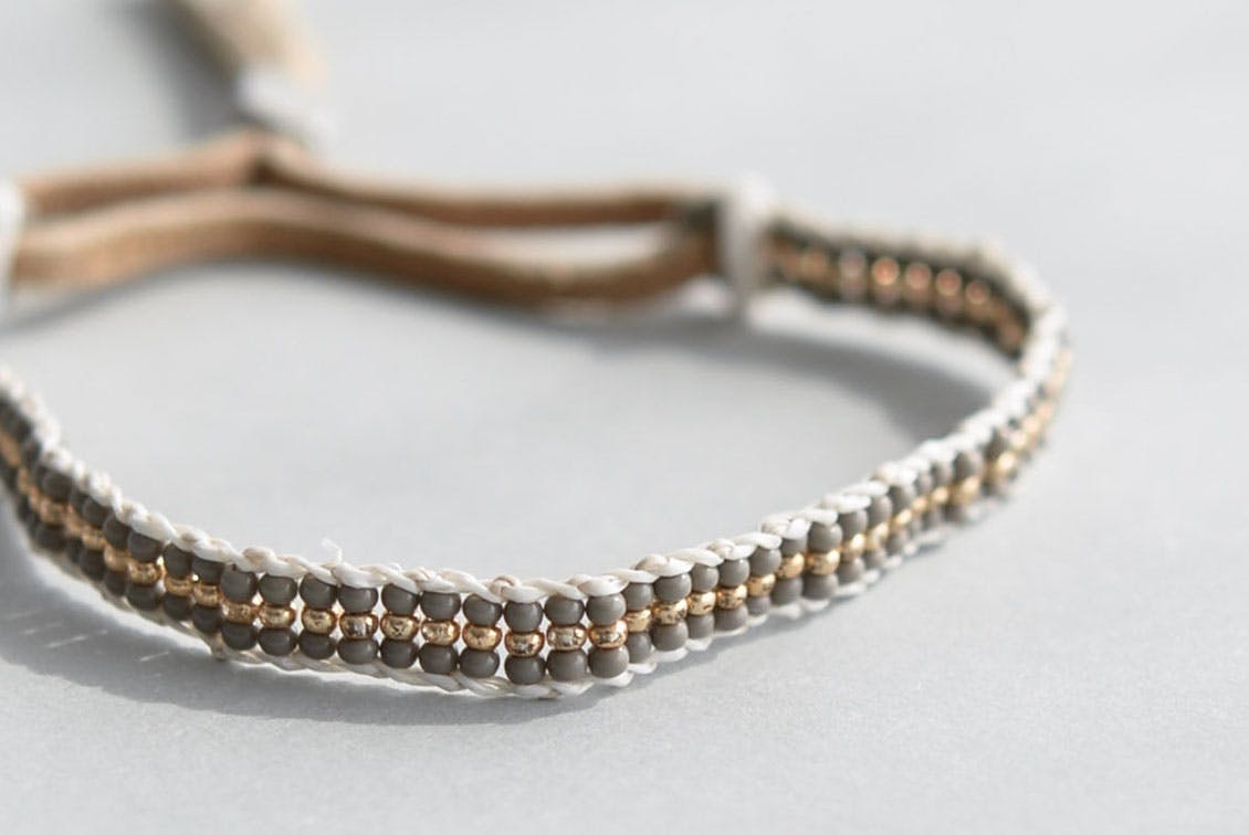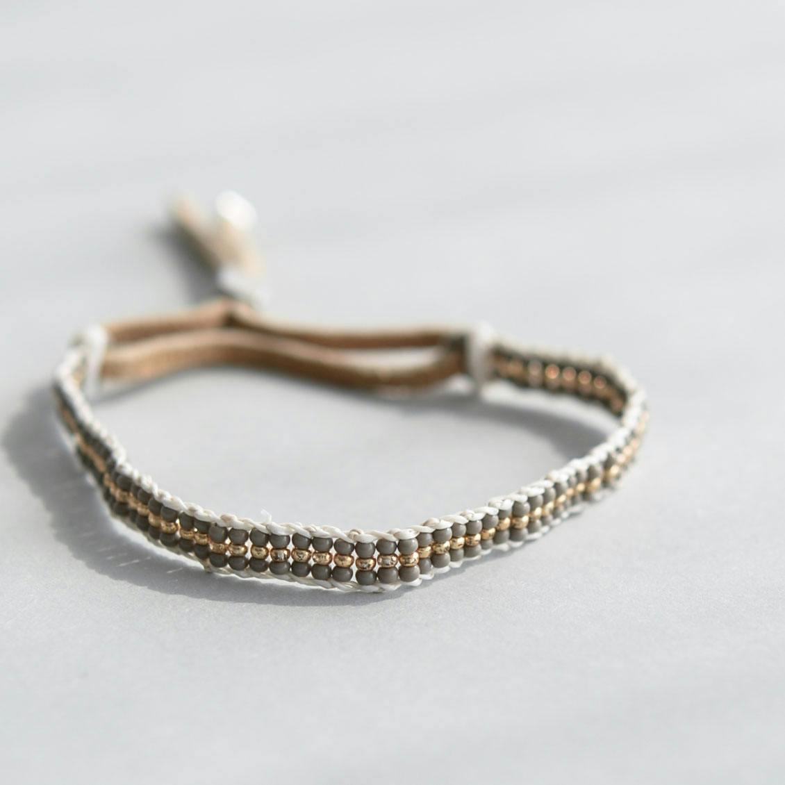手元にちょうどいいアクセントをくれるブレスレット。そのワケは、グレーや白などをベースにしたニュアンスカラーだから。