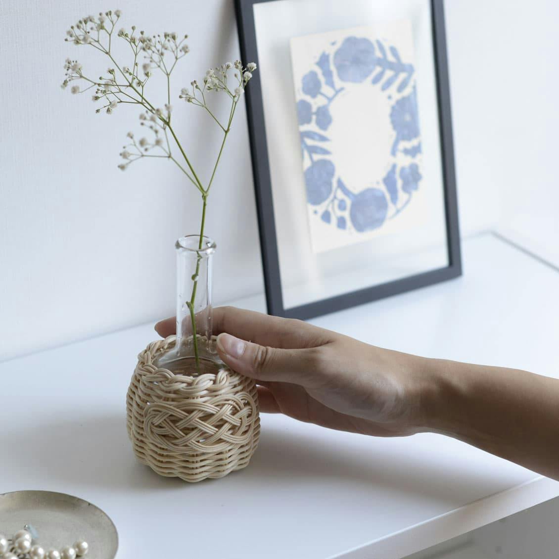 筒状に伸びた口部分と、やわらかな籐のデザインは、シンプルに一輪生けるだけで様になります。大きい花器だど、どの花を組み合わせるか迷ってしまう方も、より気軽にお花を楽しむことができそうです。