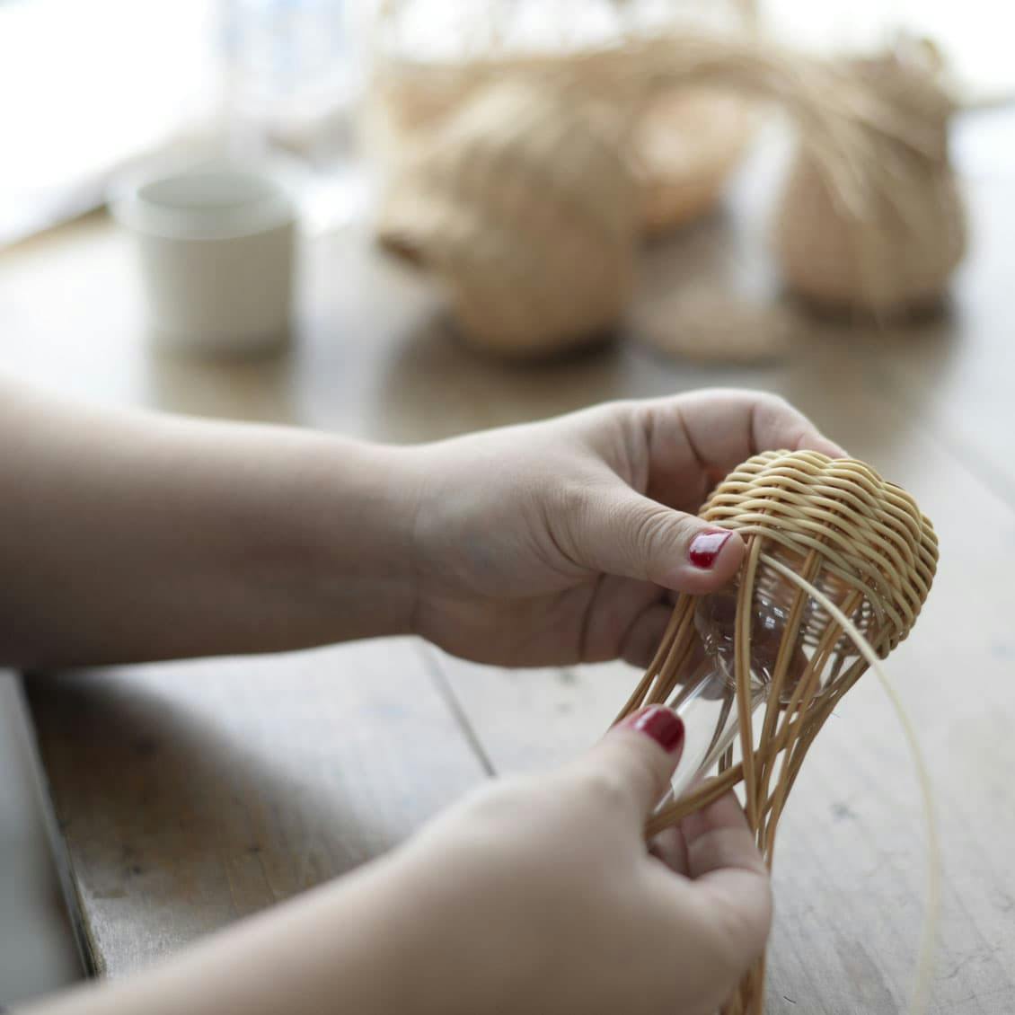 ラタンを使って、カゴやコサージュなど様々な作品を作っている作家の齋藤さん。暮らしのなかで、目に入った時にちょっとでも「楽しい」と感じてもらえるものづくりをしたいと話します。