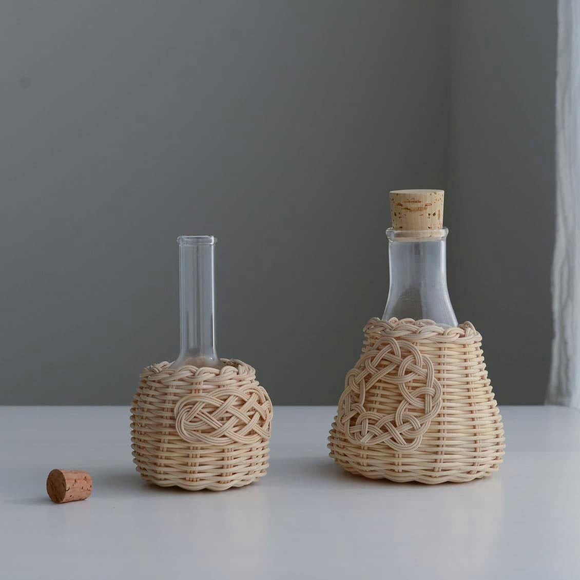 その特徴的なフォルムは、丸底フラスコにラタン(籐)を編み込んで作られたもの。