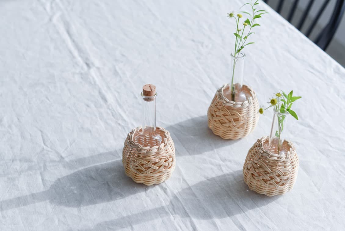 花びんとしてはもちろん、ラタン(籐)で編まれた愛らしいかたちは、花を活けていない日も、ただそこに置いてあるだけで気持ちを和ませてくれます。