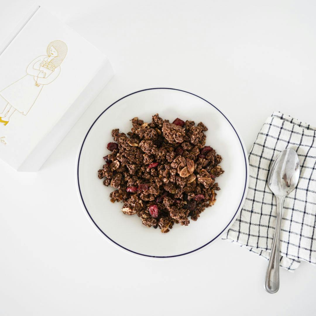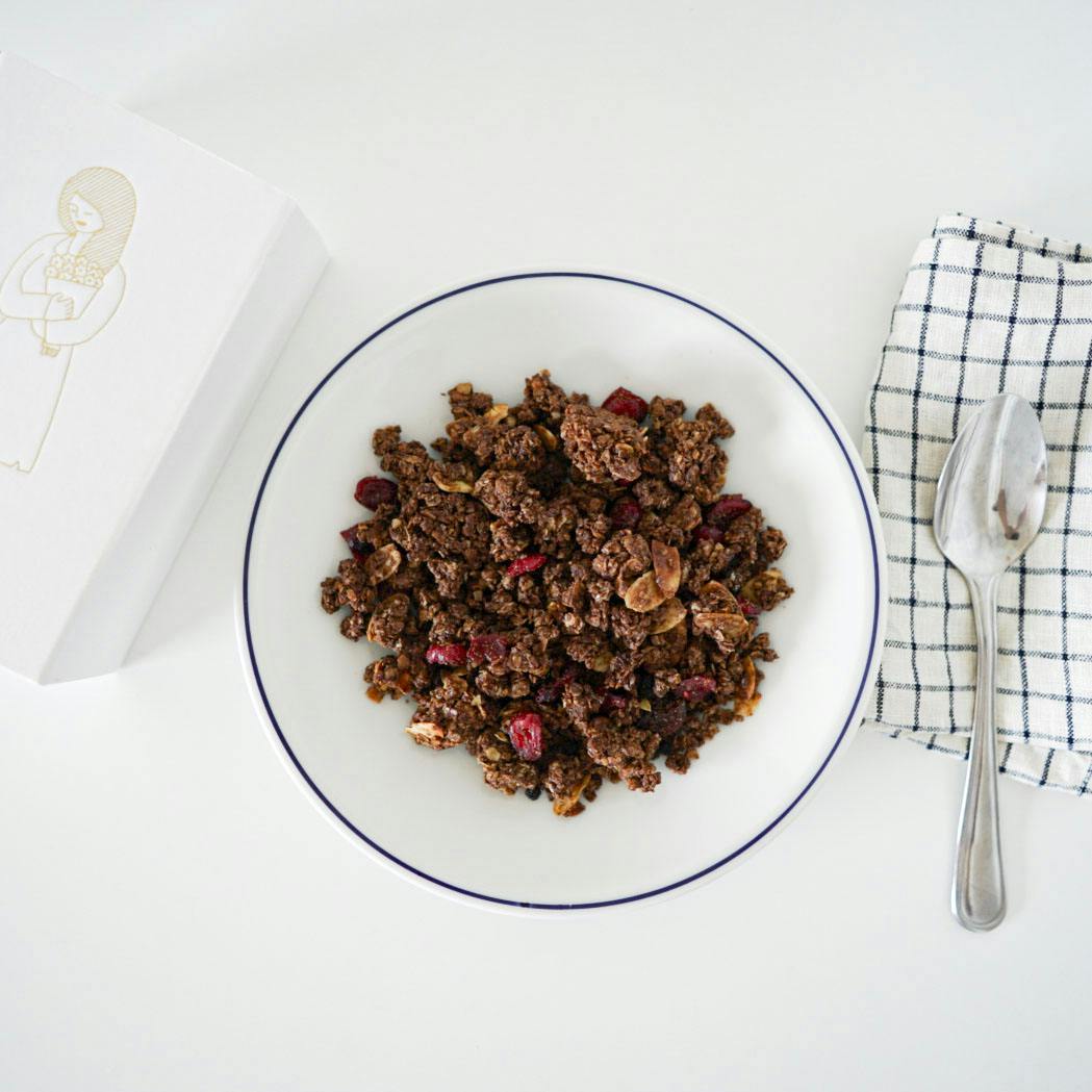 オートミール&全粒粉の "サクサク" 食感がおいしいグラノーラ。甘さひかえめのビターなココア味は、発売以来とても人気をいただいている商品です。