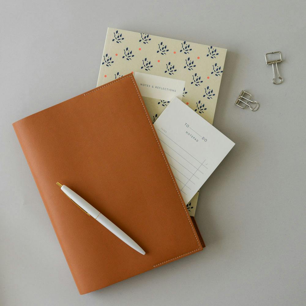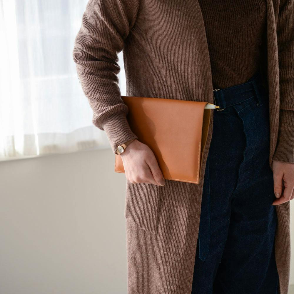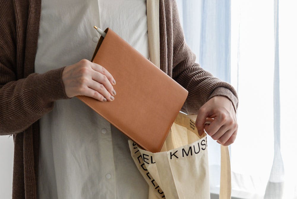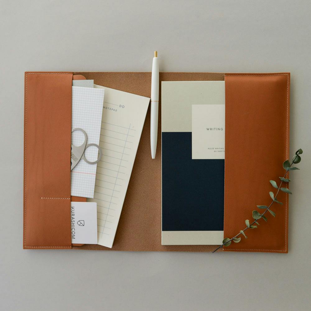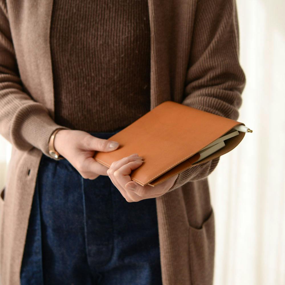 コペンハーゲン発のブランド「KARTOTEK(カトテック)」の、ノートやメモパッドを入れるために作られたレザーファイルは、お気に入りの小物も一緒に持ち運べるポケット付き。