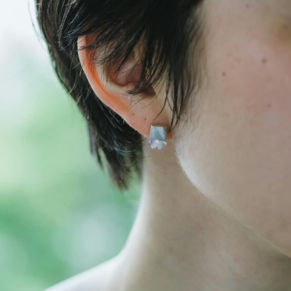 顔まわりが明るくなるシルバーは、かっこよくなりすぎないよう淡いパープルの天然石・ライトアメジストをアクセントに。