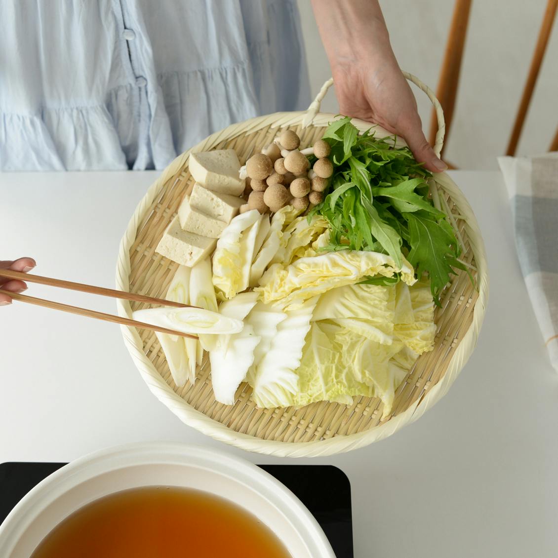 30cmは、2〜3人分の鍋料理の具材を並べたり、食材の水切りにちょうどいいサイズ。下ごしらえから食卓まで使えて便利です。