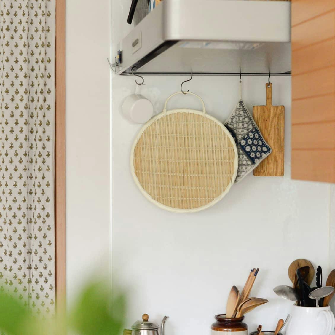 こちらの竹ざるには持ち手がついてるので、風通しの良いところに引っ掛けたまま、乾燥させながら収納ができます。