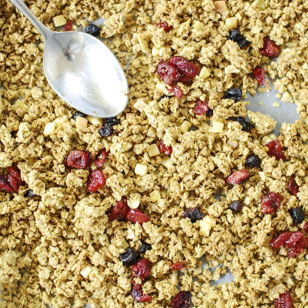 オーブンに入れる前に、ぎゅっと天板に押し込めてから焼き、板状に仕上がったグラノーラを、あえて粗めに砕いています。
