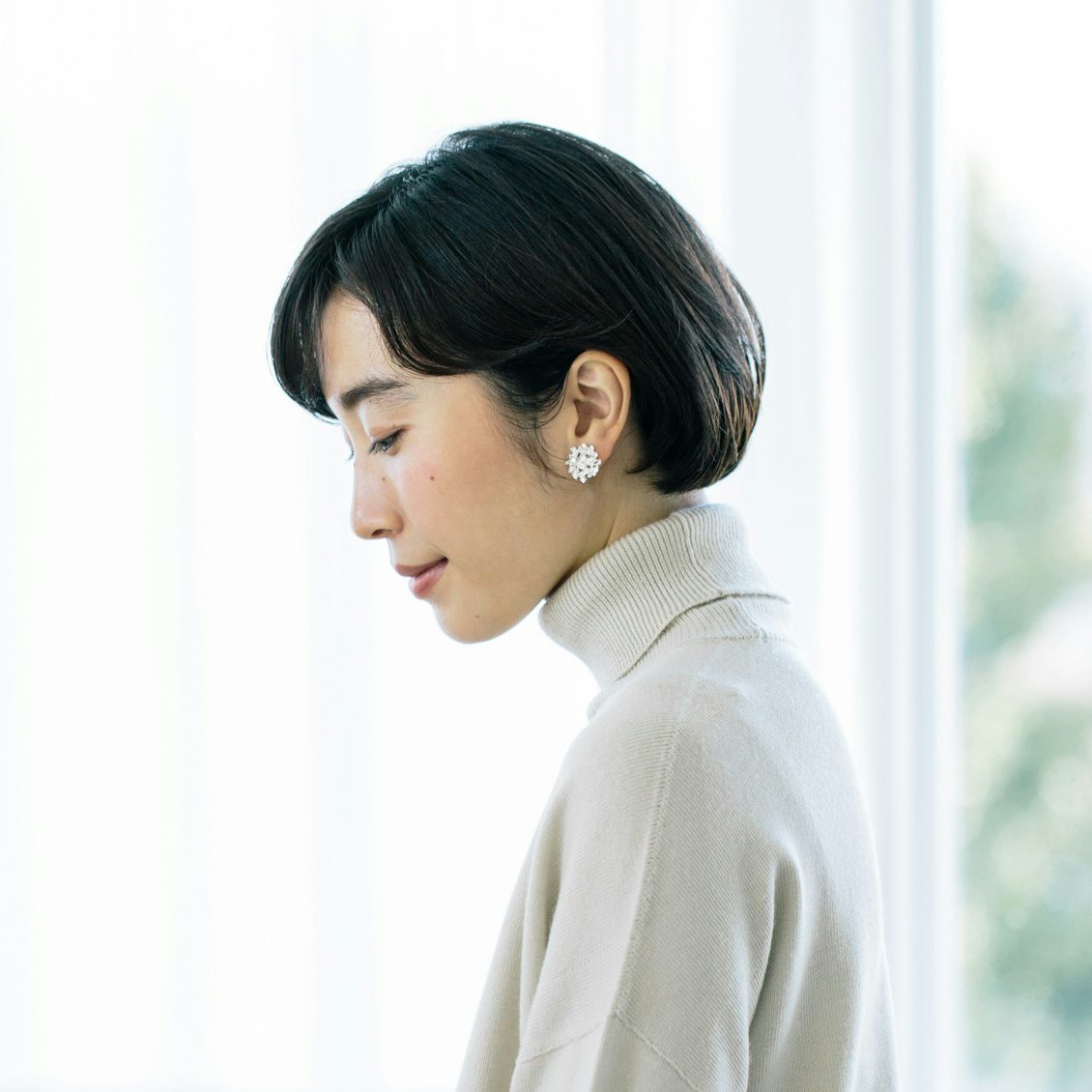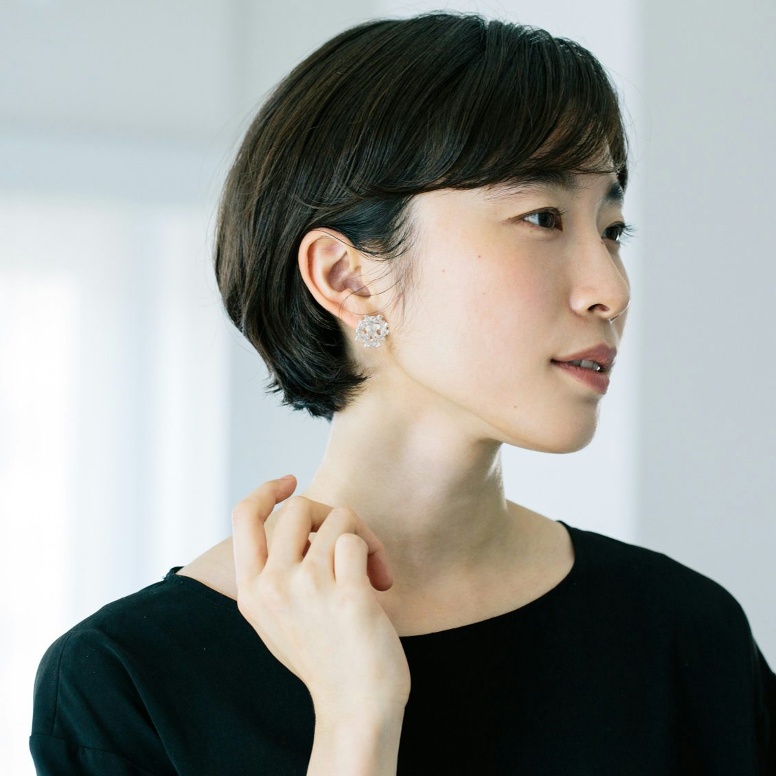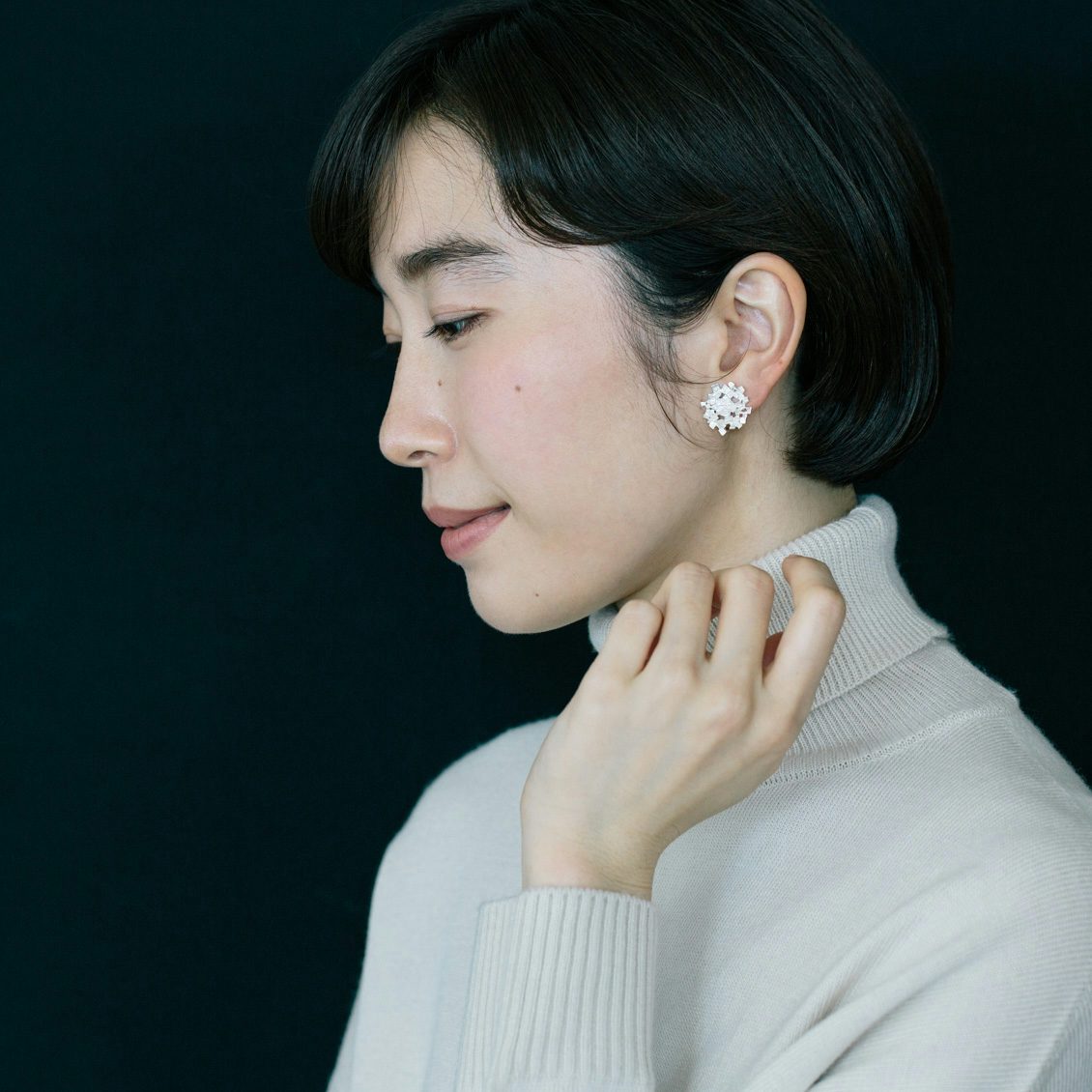 イヤリングは金具が見えにくい作りとなっており、ピアスのようにさりげなくつけられます。