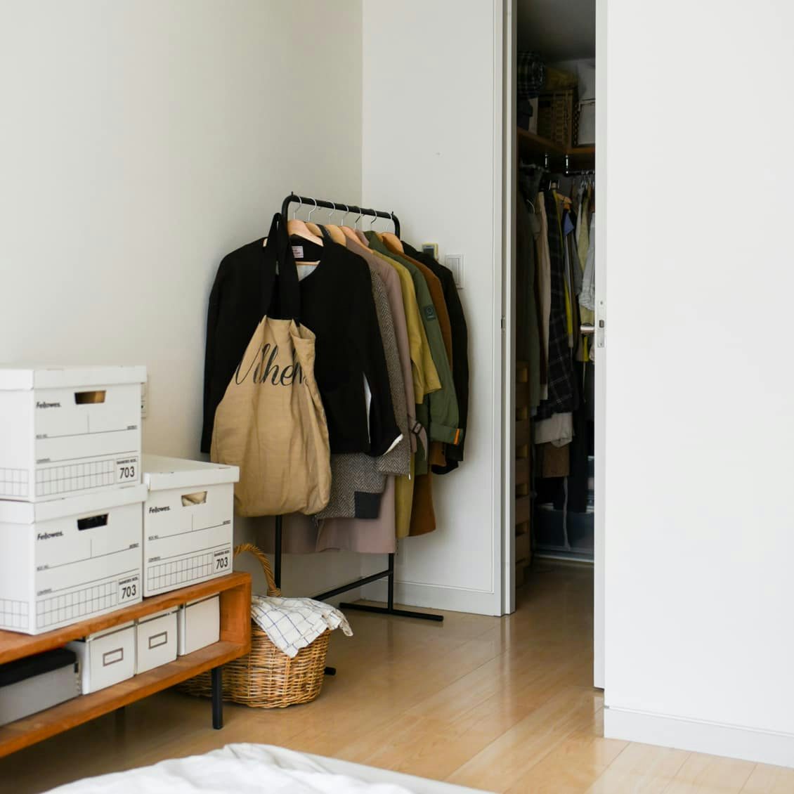 洋服がさっと手に取れて、便利なコートラック。けれど、どうしてもお部屋の中で存在感が出てしまうのが悩みでした。