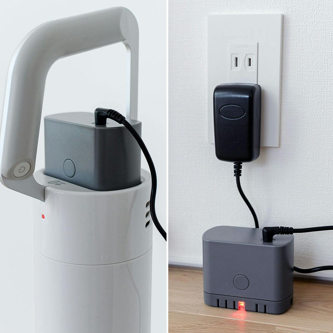 バッテリーは本体にセットしたままでも、外してバッテリー単体でも充電できます。赤色が点灯した状態が充電中、青色になると充電完了のサイン。フル充電までの時間はおよそ3時間です。