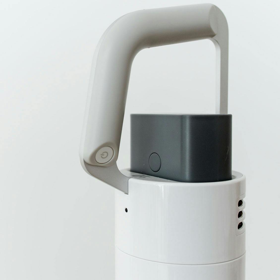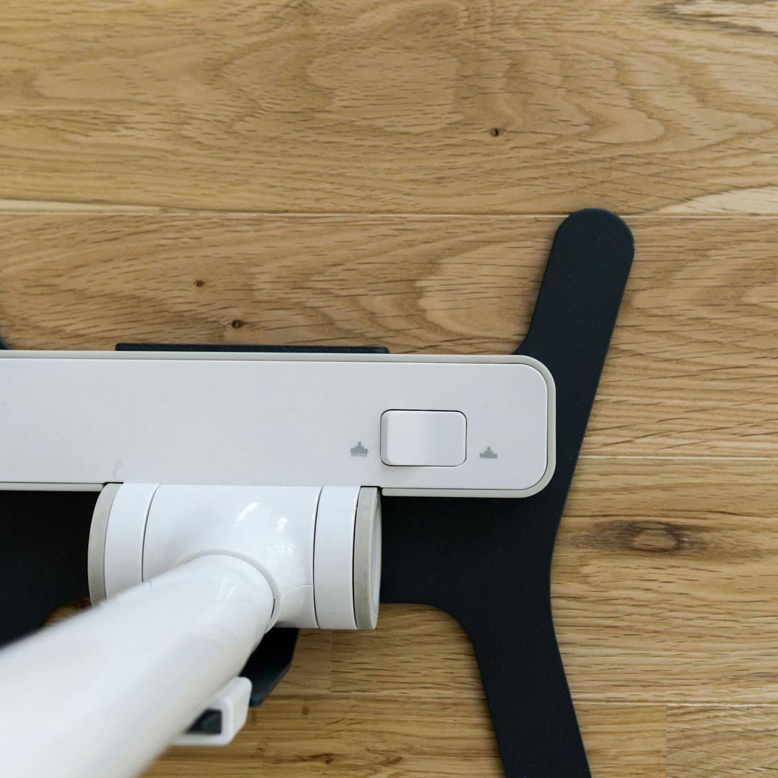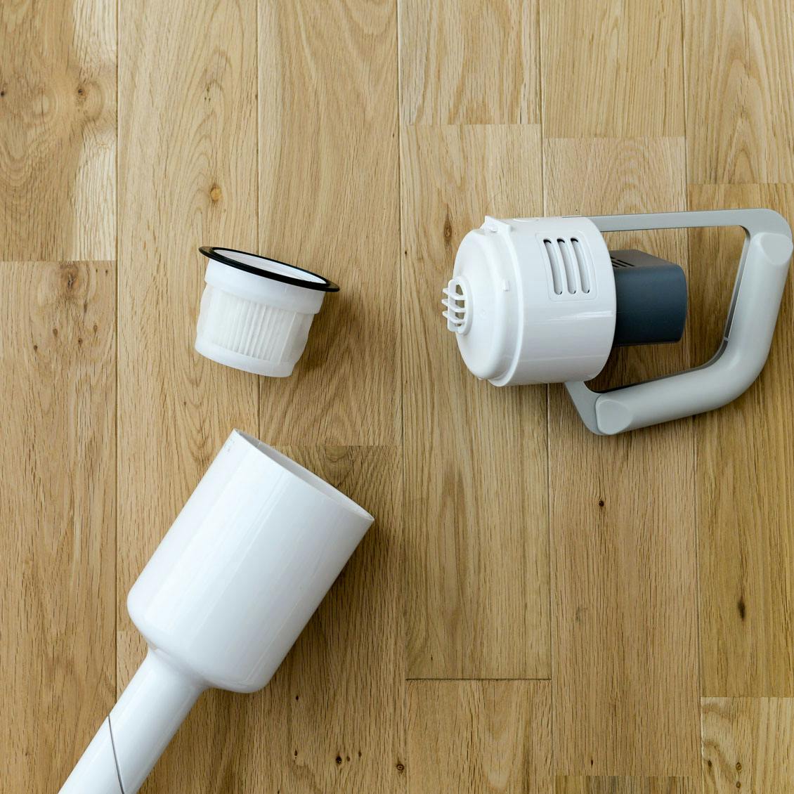 このコードレスクリーナーも、無駄のないシンプルでミニマルなデザインながら、柔らかな丸みを帯びたかたちで、パッと見たときの「メカっぽさ」がないのが魅力。家電特有の生活感がないので、リビングなど目に見える場所でも気にせず置けるんです。