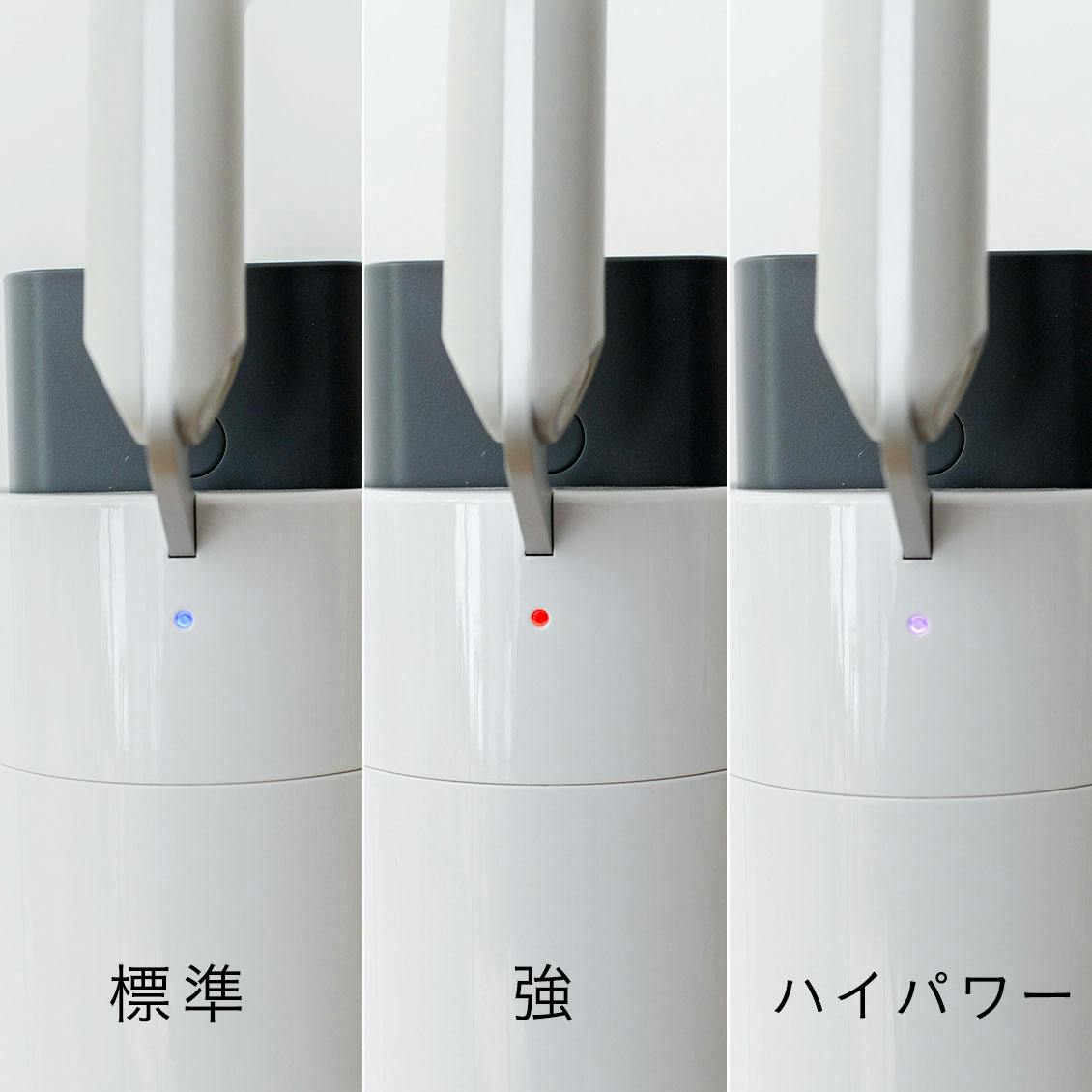 持ち手の親指部分にある電源スイッチを押せば、すぐに掃除を始められます。パワーは標準、強、ハイパワーの3段階。モードによってスイッチ付近のランプの色が変わります。