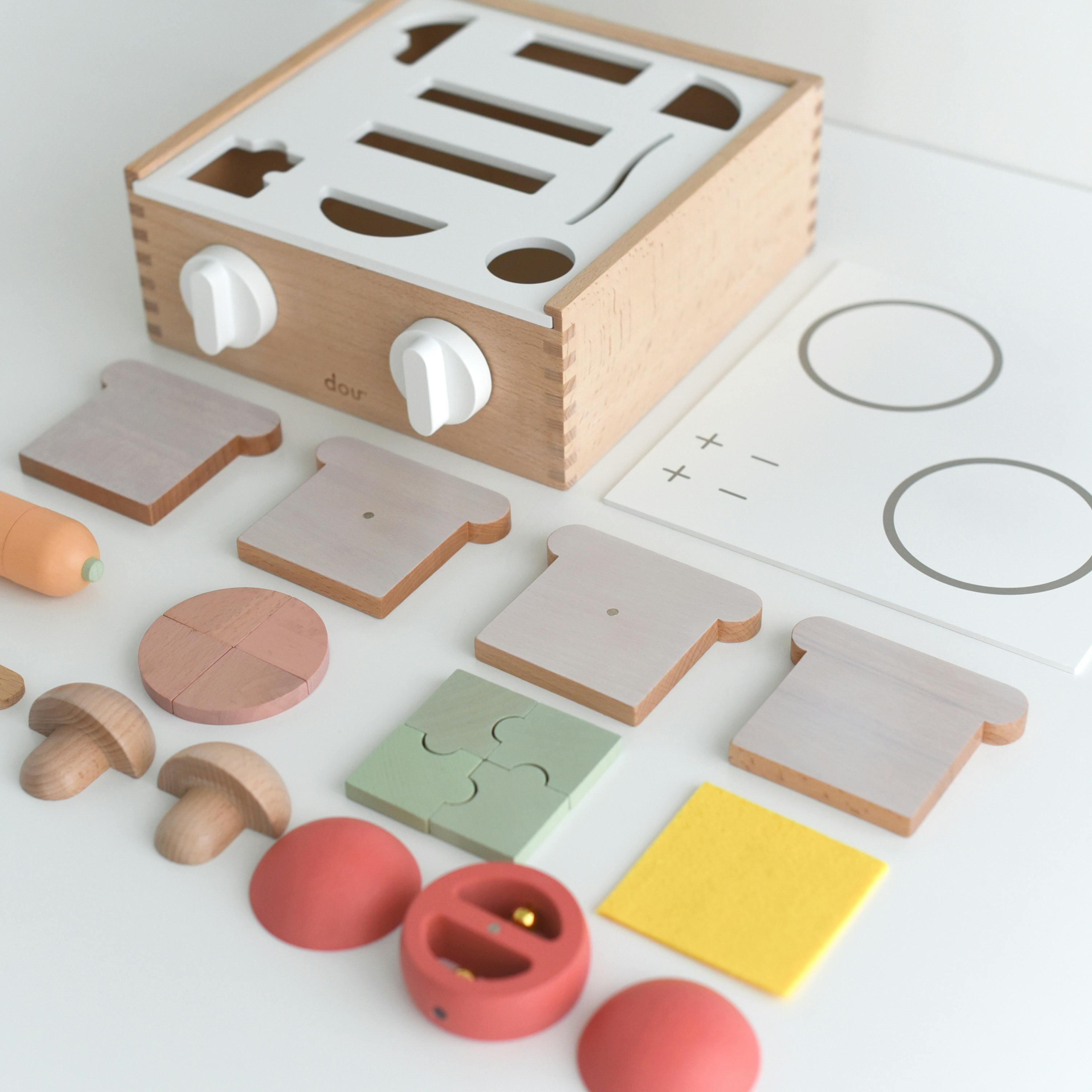 コンロ型のシンプルな箱の中には、食パンやトマト、チーズなど7種の食べ物と、包丁のおもちゃが入っています。