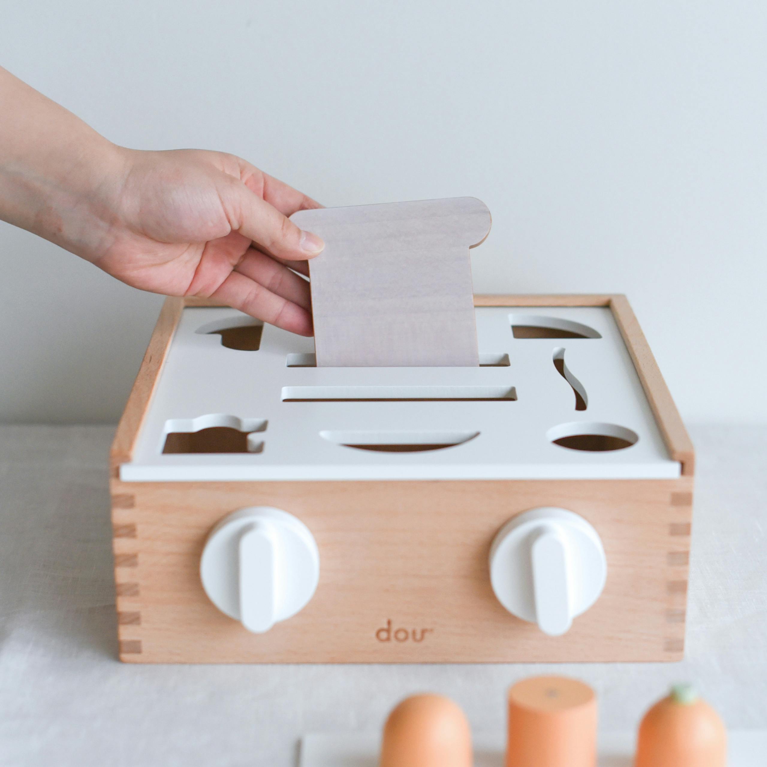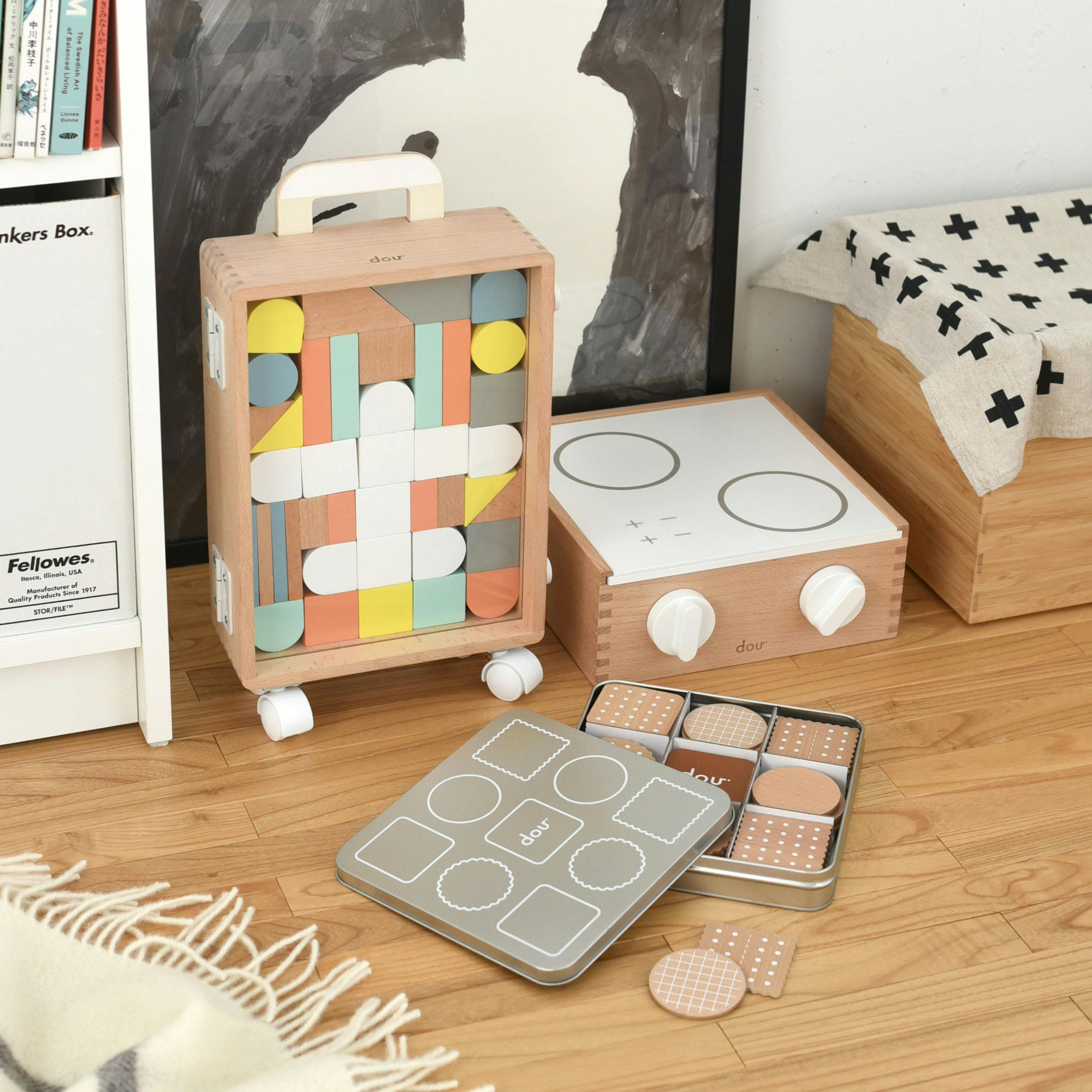 そんな時に見つけたのが「dou(ドウ)」の天然木のおもちゃ。ニュアンスカラーが優しい印象で、まるで雑貨のような見た目。遊んでいない時も出しておきたくなるアイテムです。